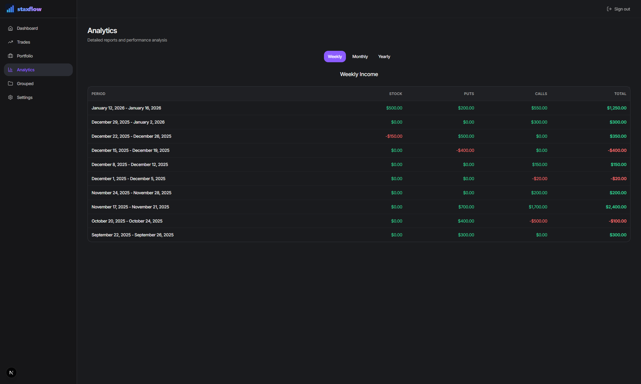 Understand your performance with detailed breakdowns. View P&L by week, month, or year.